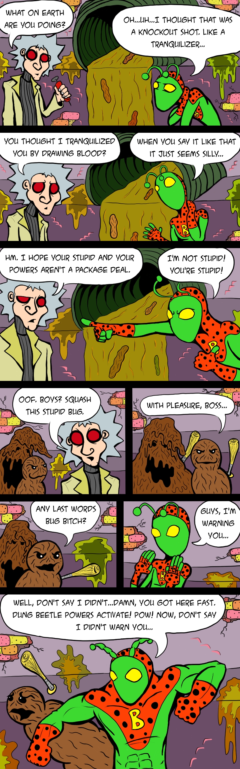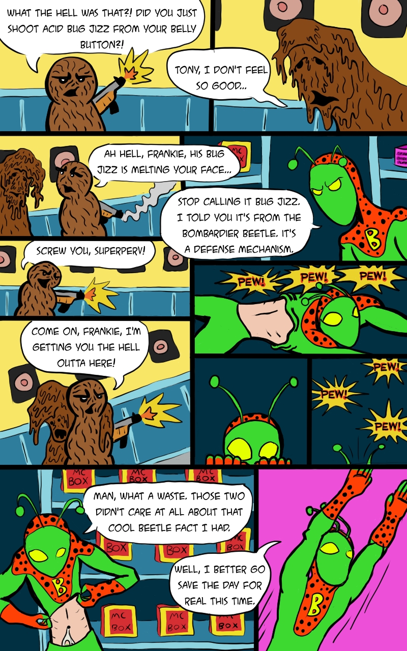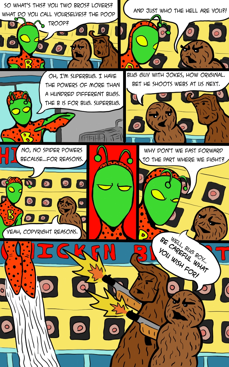 Hello and let me introduce you to the very first character in the Super Dumb Comic Universe, SUPERBUG! He has the powers of over a hundred bugs! Practically any bug you can think of outside of a spider. No spider powers. I’m not looking to have my legs broken by a couple of goons wearing mouse ears.